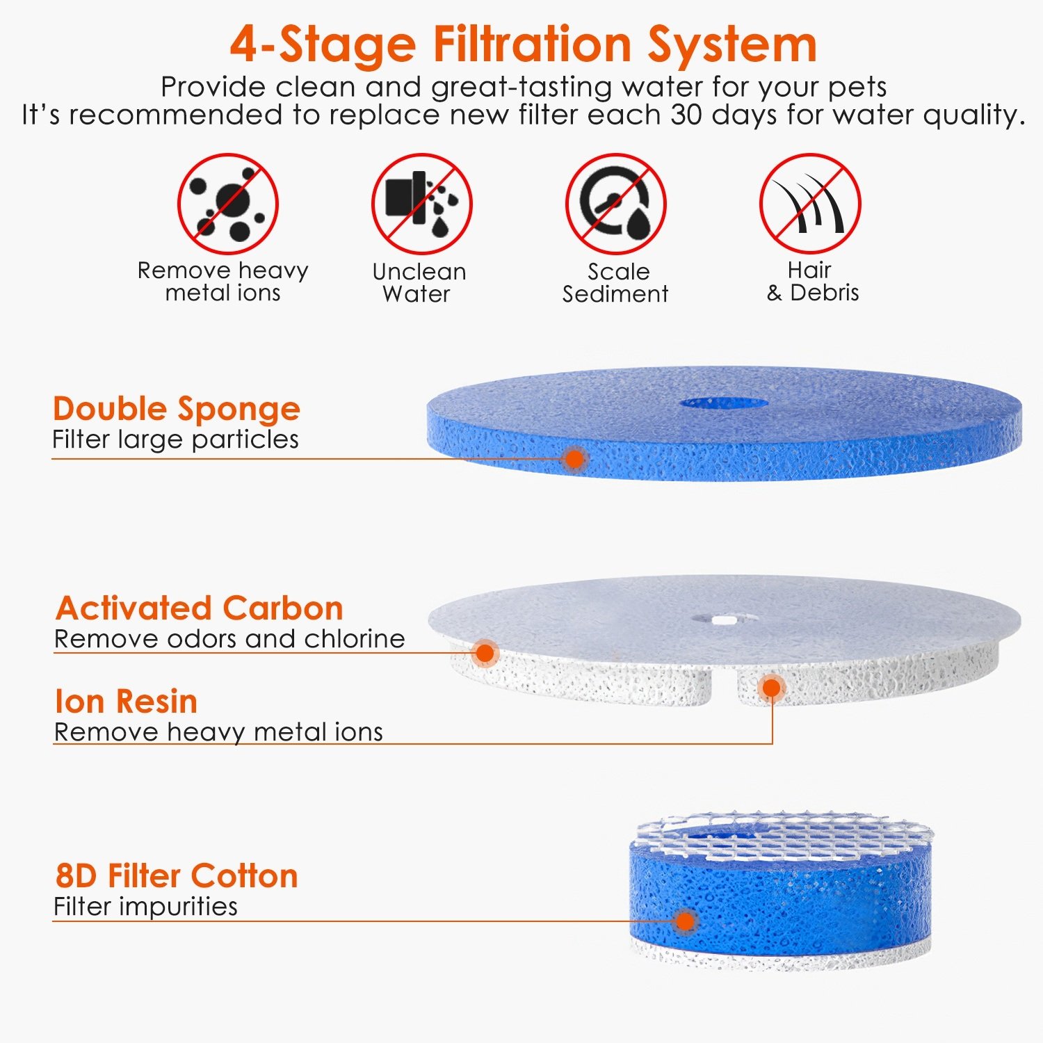 *4-Stage Filtration System*:Made of double sponge,activated carbon,ion resin and 8D filter cotton,the filter set forms a 4-stage filtration system for our GPCT4115 Pet Water Fountain to effectively remove impurities,odors,and chlorine from the water,providing clean and great-tasting water for your pets.