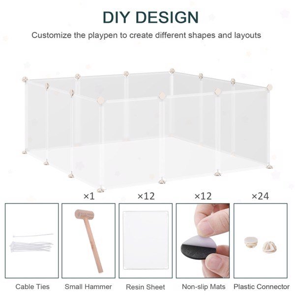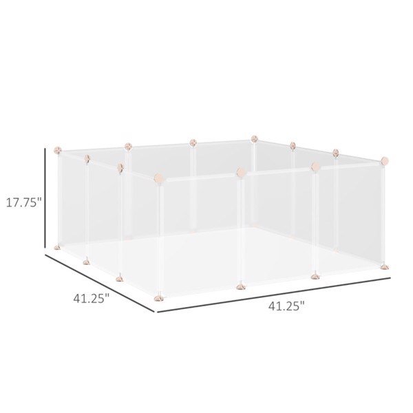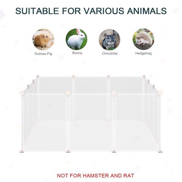 Features:- DIY design give your pet a customizable pet playpen- Suitable for small animals like bunnies, chinchillas, hedgehogs and guinea pigs- Non-slip mats and cable ties help to secure guinea pig cage- The rabbit cage keeps your pet safely confined while offering more space to play and rest- The pet barrier is made with solid metal and PP resin for a stable structure- Not suitable for hamsters and rats- Easy to set up and take downSpecification:- Color: White- Material: Metal, PP Resin- Overall Dimension: 41.25" L x 41.25" W x 17.75" H- Panel Size: 17.75" L x 13.75" WPackage Includes:- 12 x Panel- 24 x Plastic Connector- 1 x Cable Tie- 12 x Non-slip Mats- 1 x Mallet- 1 x Manual