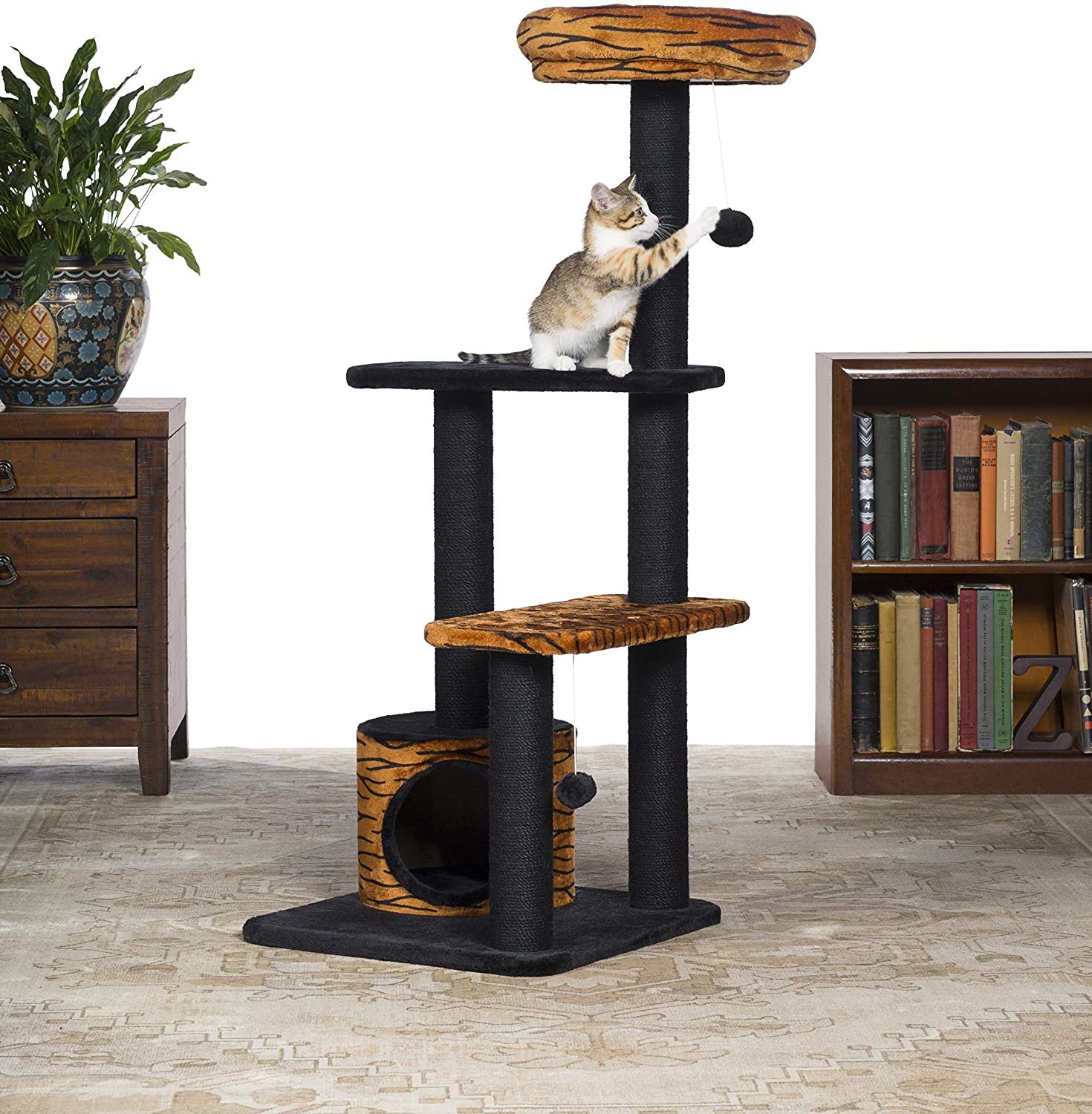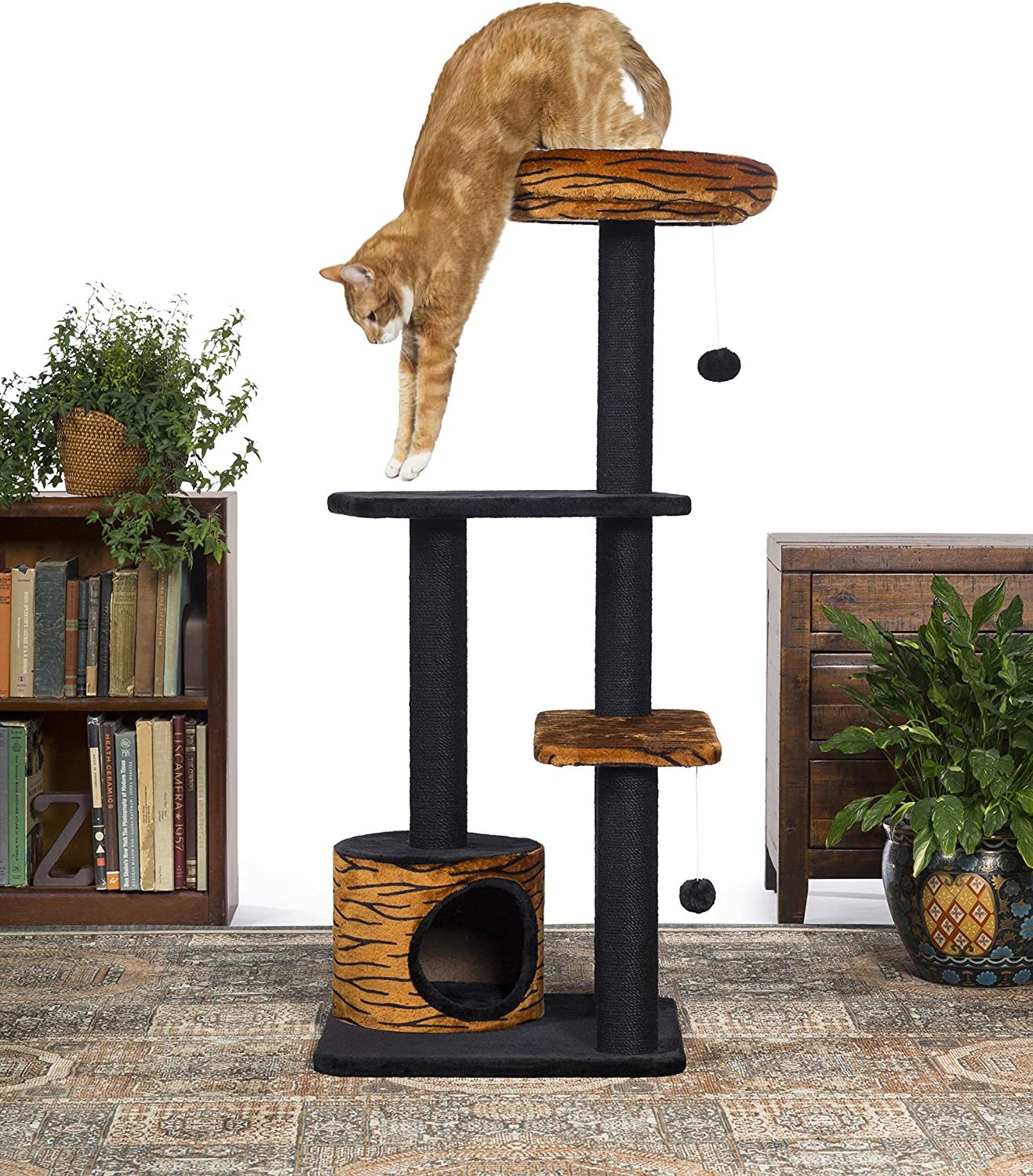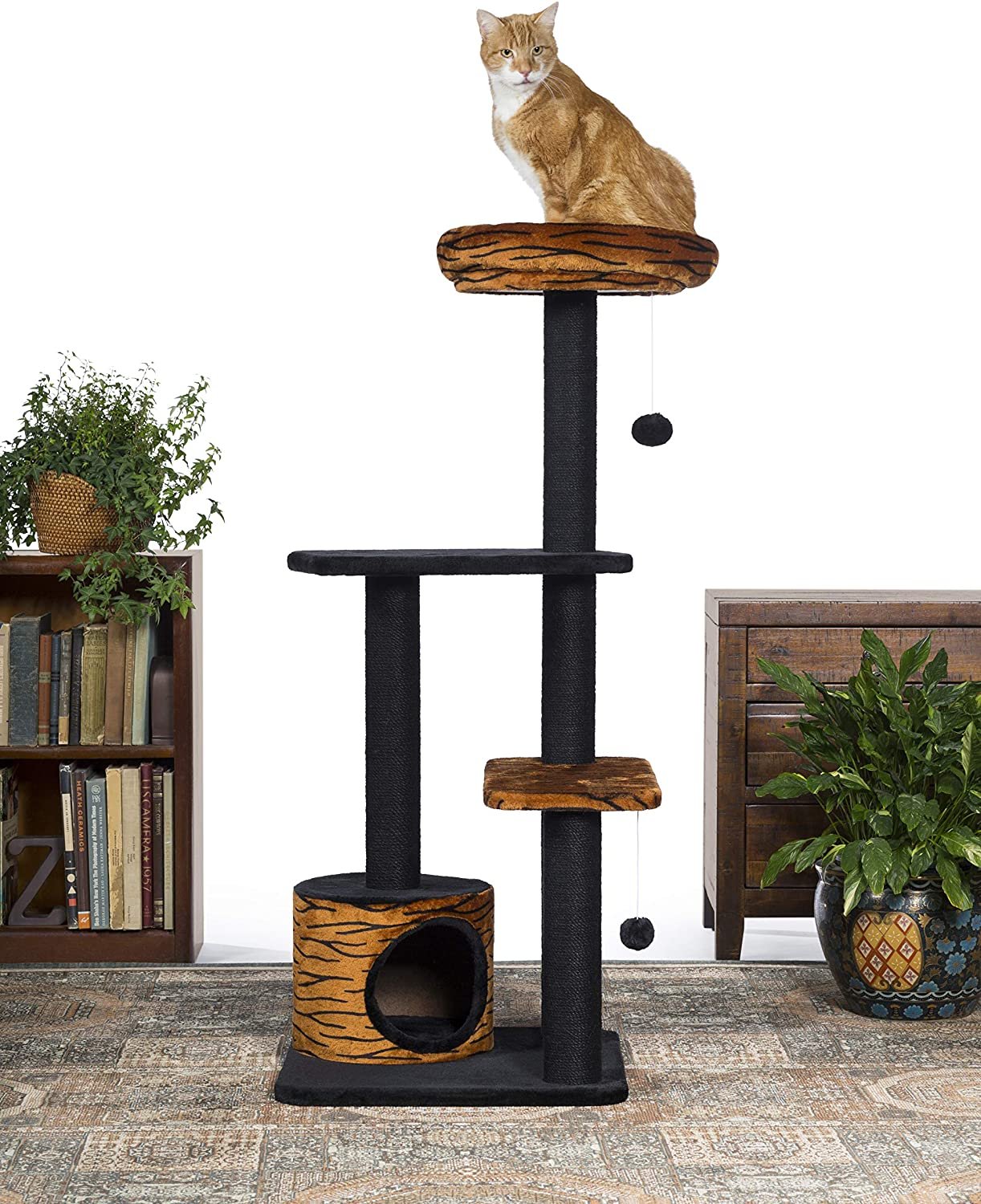 Prevue Pet Products Kitty Power Paws Leopard Terrace 7300 combines plush fabrics with durable jute to provide the perfect place for sleeping, scratching and playing. A luxurious leopard print bolstered day bed is great for surveying surroundings or taking a cat nap. 2 swat toys hang playfully while jute rope scratching posts offer an appealing texture to cats, curbing inappropriate scratching. An additional platform provides opportunities for pouncing and jumping. 20 1/2'' Long, 17 1/2'' Wide and 21'' High.