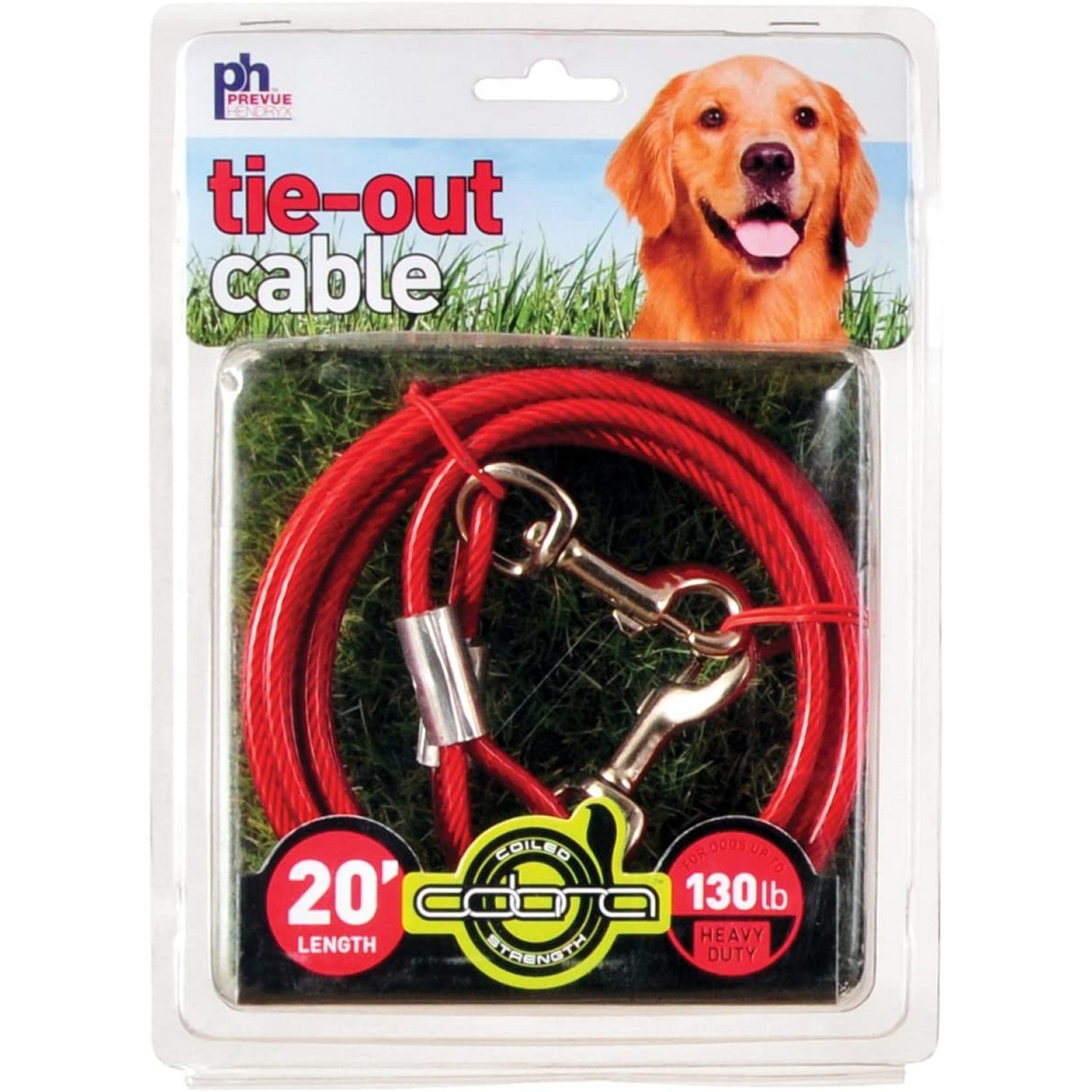 Prevue Pet Products heavy-duty 20Æ TIE-OUT cable 2122 is designed for dogs up to 130 lbs. Heavy duty, galvanized aircraft-grade wound-steel cable is housed within crack-resistant, high visibility red vinyl casing to ensure your dog stays safe and secure. Premium quality die-cast iron swivel bolt snaps at both ends to connect easily. Heavy duty tie out cable is 20 foot long with a 4.0 mm diameter wire cable; 6.3 mm in vinyl casing.