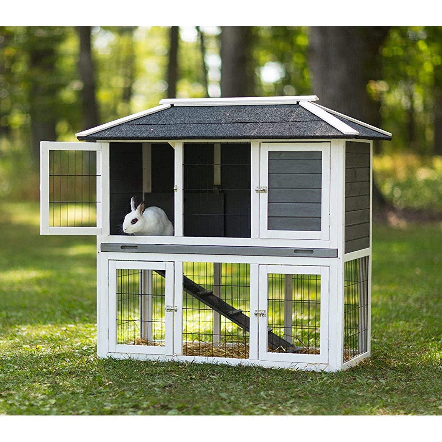 Prevue Pet Products Rabbit Hutch Duplex 4601 is a safe and spacious two story indoor or outdoor home for your rabbit. A cozy interior house sits above a protected lower play area - simply close the ramp to keep upper and lower levels separate. Four hinged doors allow access to all areas of the house plus play yard and lock securely when not in use. A removable galvanized tray prevents rusting and is easy to clean. Crafted from a fine weather-resistant variety of fir tree lumber and coated with a protective, pet-safe, Gray stain with asphalt coated roof panels to protect your bunnies from inclement weather. Designed for use by one or more rabbits, all Prevue rabbit hutches undergo independent lab testing to conform to the highest levels of pet safety. Our Duplex Rabbit Hutch 4601 measures 44 1/8’’ long, 21 ¾’’ wide and 45 ½’’ high with 1’’ wire spacing. Measurements with roof overhang are 49 ¼’’ long and 26 ¾’’ wide. To maintain the longevity of your purchase, we recommend that you periodically treat it with a non-toxic sealant and protect the hutch with a tarp or other covering during extended periods of inclement weather.