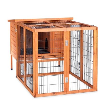 Includes c-hook lock hardware that securely connects the playpen to the small bunny hutch, enabling your rabbit space to wander while keeping them safe and sound. Quickly access your pet from the large top door, featuring c-hook latches or one of the two side doors with secure twin locks.