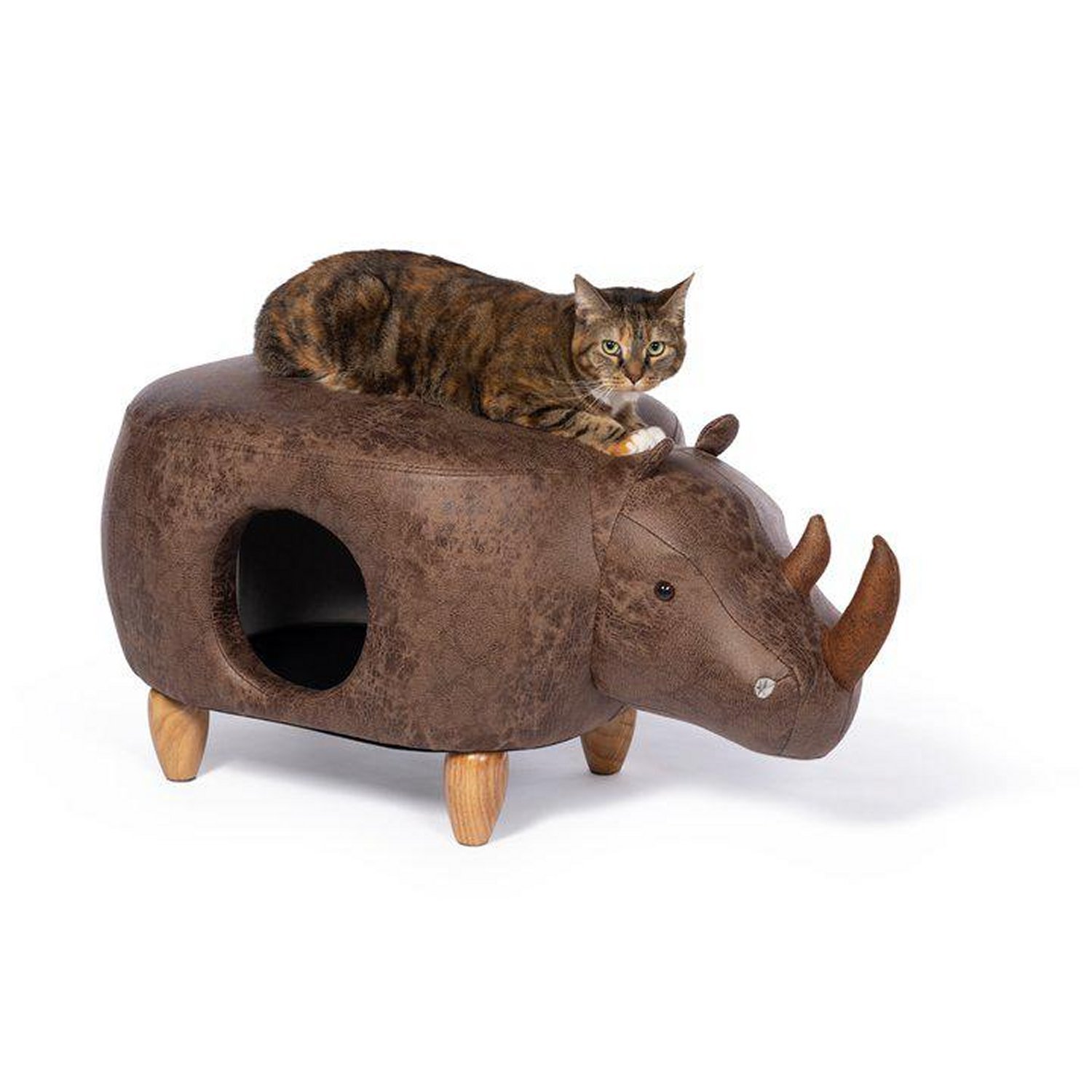 Prevue Pet Products Rhinoceros Ottoman 7391 allows you to spend quality time with your cat or small dog. Footstool features a fun and cozy hideout for your cat, kitten or small dog plus ample space to kick up your feet, let your pet lounge on top, or both! This sturdy hassock makes the perfect companion to any comfy chair and adds a touch of whimsy to any room. The luxurious brown faux-leather, polyester fabric and solid pinewood legs complement your home décor. Prevue Pet Products Brown Rhinoceros Ottoman 7391 measures 35” Long from the back to the tip of the rhinoceros horn, 18” Wide and 16” High with a hideaway opening 7 ½’’ in diameter. For indoor use only.