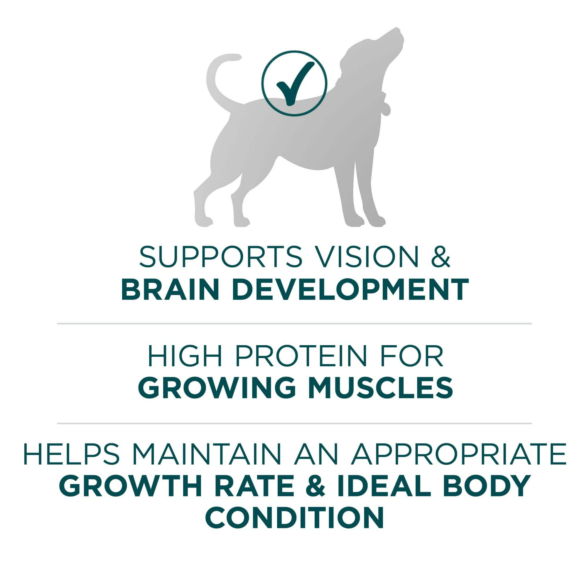 Provide your large breed puppy with the nutrition their growing body needs to help them grow up big and strong by serving Purina ONE Plus High Protein Large Breed Dry Puppy Food. Packed with a wealth of healthy ingredients, this high protein dog food supports strong muscles, including a healthy heart and features real chicken as the number one ingredient. To support their skin and coat and help them look their healthy and shiny best, Omega-6 fatty acids, along with dog vitamins and minerals are added to this dog kibble for results you can see. To maintain mobility and promote hip and joint health, this formula provides glucosamine for dogs. This large dog food for puppies comes packed with DHA, a nutrient found in mother’s milk, which supports vision and brain development and four antioxidant sources to promote their developing immune system. Each serving of this large breed puppy dry food will excite them with deliciously crunchy bites and tender meaty morsels that provide the Purina ONE dry dog food taste and textures puppies love with added calcium to promote strong teeth and healthy gums. To ensure that more nutrition goes to work inside your dog, this Purina ONE dry dog food is designed to be highly digestible. Help your large breed puppy start their life on the right paw by giving them the 100 percent complete and balanced nutrition of Purina ONE Plus High Protein Large Breed Dry Puppy Food.